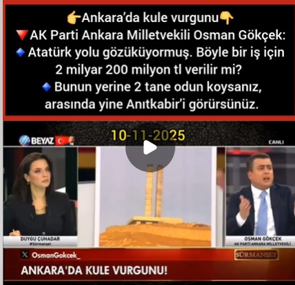 AK Parti Milletvekili Osman Gökçek, 10 Kasım 2025 tarihinde Beyaz TV‘de katıldığı “Sürmanşet” programında, Ankara’da yapımı planlanan bir kule projesini sert bir dille eleştirdi. Projenin tek işlevinin “Atatürk yolunu göstermek” olduğunu iddia eden Gökçek, şu ifadeleri kullandı: “Böyle bir iş için 2 milyar 200 milyon TL verilir mi? Bunun yerine 2 tane odun koysanız, arasında yine Anıtkabir’i görürsünüz,“.