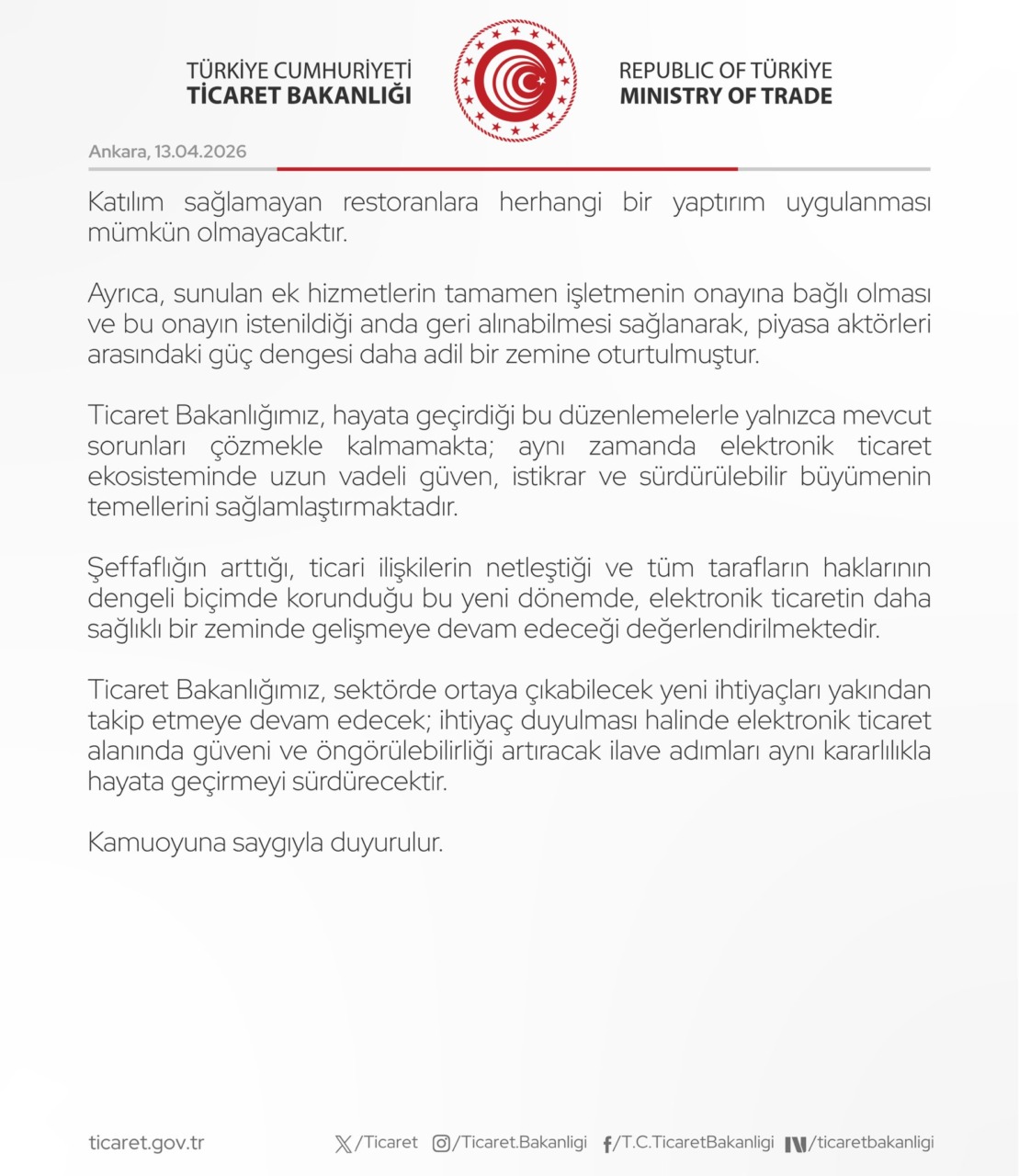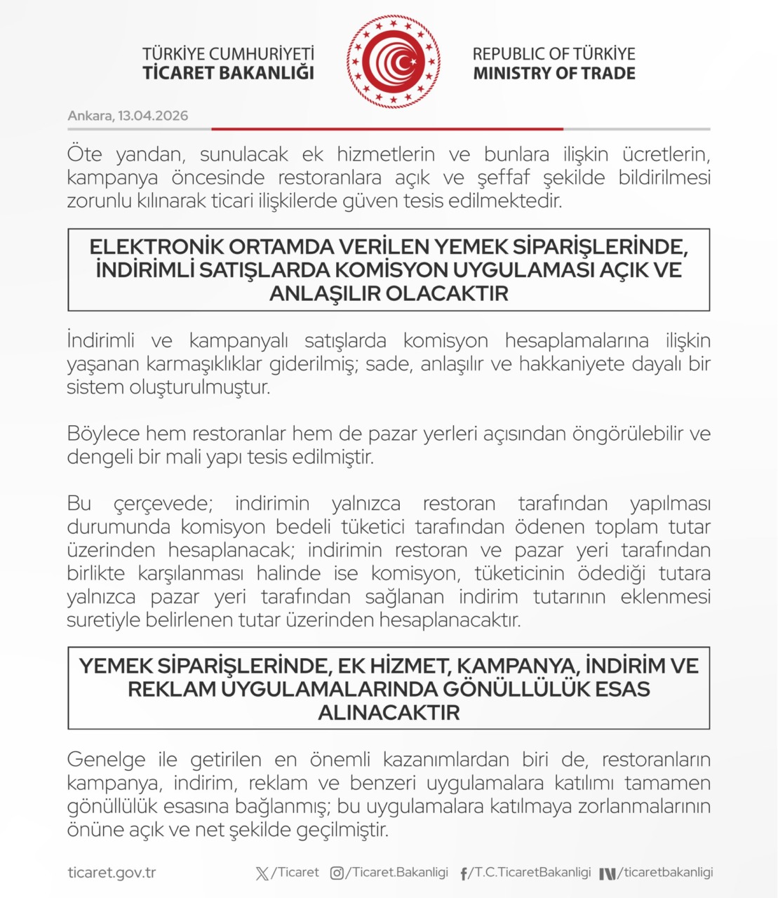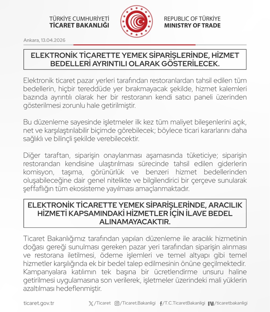 Bu düzenleme sayesinde işletmeler ilk kez tüm maliyet bileşenlerini açık, net ve karşılaştırılabilir biçimde görebilecek; böylece ticari kararlarını daha sağlıklı ve bilinçli şekilde verebilecektir. Diğer taraftan, siparişin onaylanması aşamasında tüketiciye; siparişin restorandan kendisine ulaştırılması sürecinde tahsil edilen giderlerin komisyon, taşıma, görünürlük ve benzeri hizmet bedellerinden oluşabileceğine dair genel nitelikte ve bilgilendirici bir çerçeve sunularak şeffaflığın tüm ekosisteme yayılması amaçlanmaktadır” ifadelerine yer verdi.