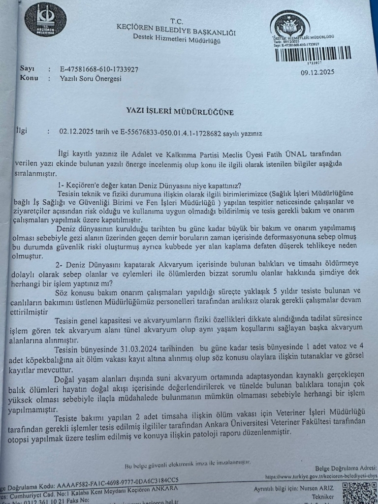 AK Parti döneminde Türkiye‘nin eğitim amaçlı ilk ve tek akvaryumu olarak Keçiören’e kazandırılan Deniz Dünyası, CHP’li Keçiören Belediyesi yönetimi altında bakımsızlığa terk edilerek kapatıldı. Tesiste bulunan binlerce balık ve iki Nil timsahının öldüğü, ABB AK Parti Grup Sözcüsü Av.Fatih Ünal’ın soru önergesi üzerine belediyenin verdiği resmi cevap yazısıyla kesinleşti.