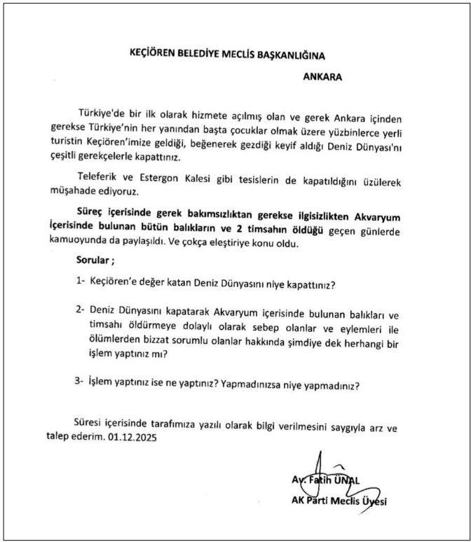 AK Parti Keçiören Belediye Meclis Üyesi Fatih Ünal, konuyu meclis gündemine taşıyarak CHP’li yönetimi ağır sözlerle eleştirdi. Ünal’ın hazırladığı soru önergesinde şu kritik sorular yer aldı: “Deniz Dünyası’nı niye kapattınız? Akvaryumda bulunan balıkların ve 2 timsahın ölümünden sorumlu olanlar hakkında herhangi bir işlem yaptınız mı? Eğer işlem yaptıysanız ne yaptınız, yapmadıysanız neden yapmadınız?”