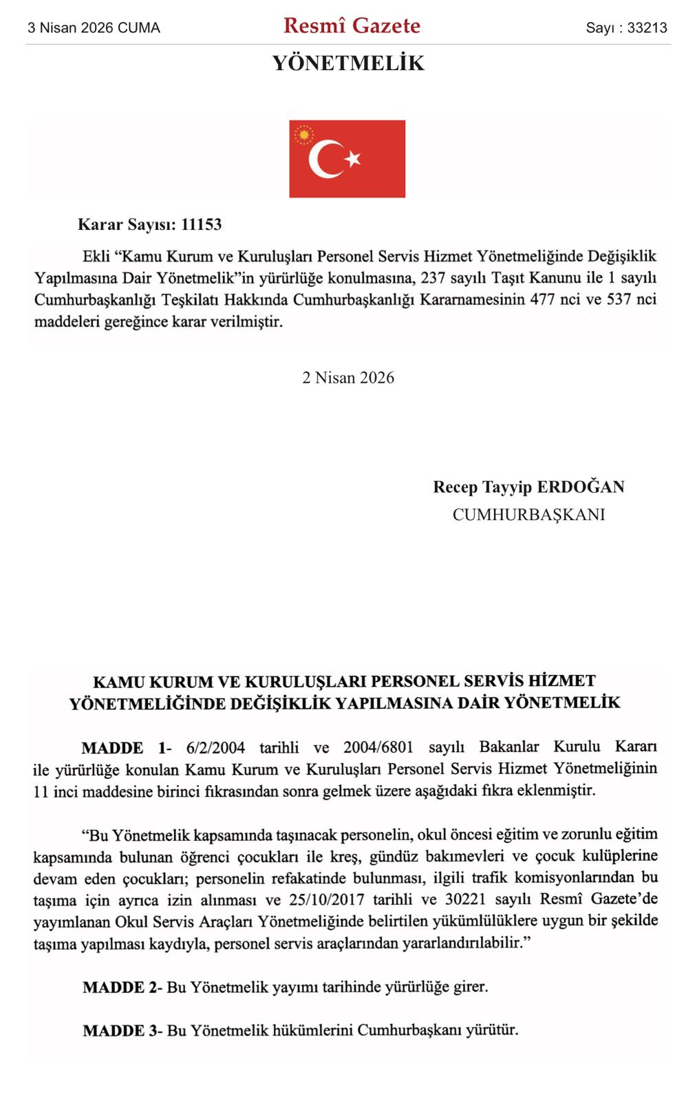 “Kamu Kurum ve Kuruluşları Personel Servis Hizmet Yönetmeliğinde Değişiklik Yapılmasına Dair Yönetmelik” Resmi Gazete‘de yayımlanarak yürürlüğe girdi.