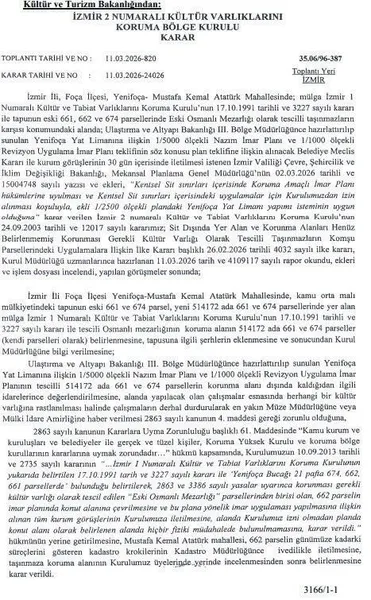 Kültür ve Turizm Bakanlığı’na bağlı İzmir 2 Numaralı Kültür Varlıklarını Koruma Bölge Kurulu, yat limanı projesi kapsamında, bölgedeki tarihi mirası da ilgilendiren önemli bir karar aldı. Kurul, proje sahasıyla birlikte tescilli Osmanlı mezarlığına ilişkin yeni düzenlemeleri yürürlüğe koydu.