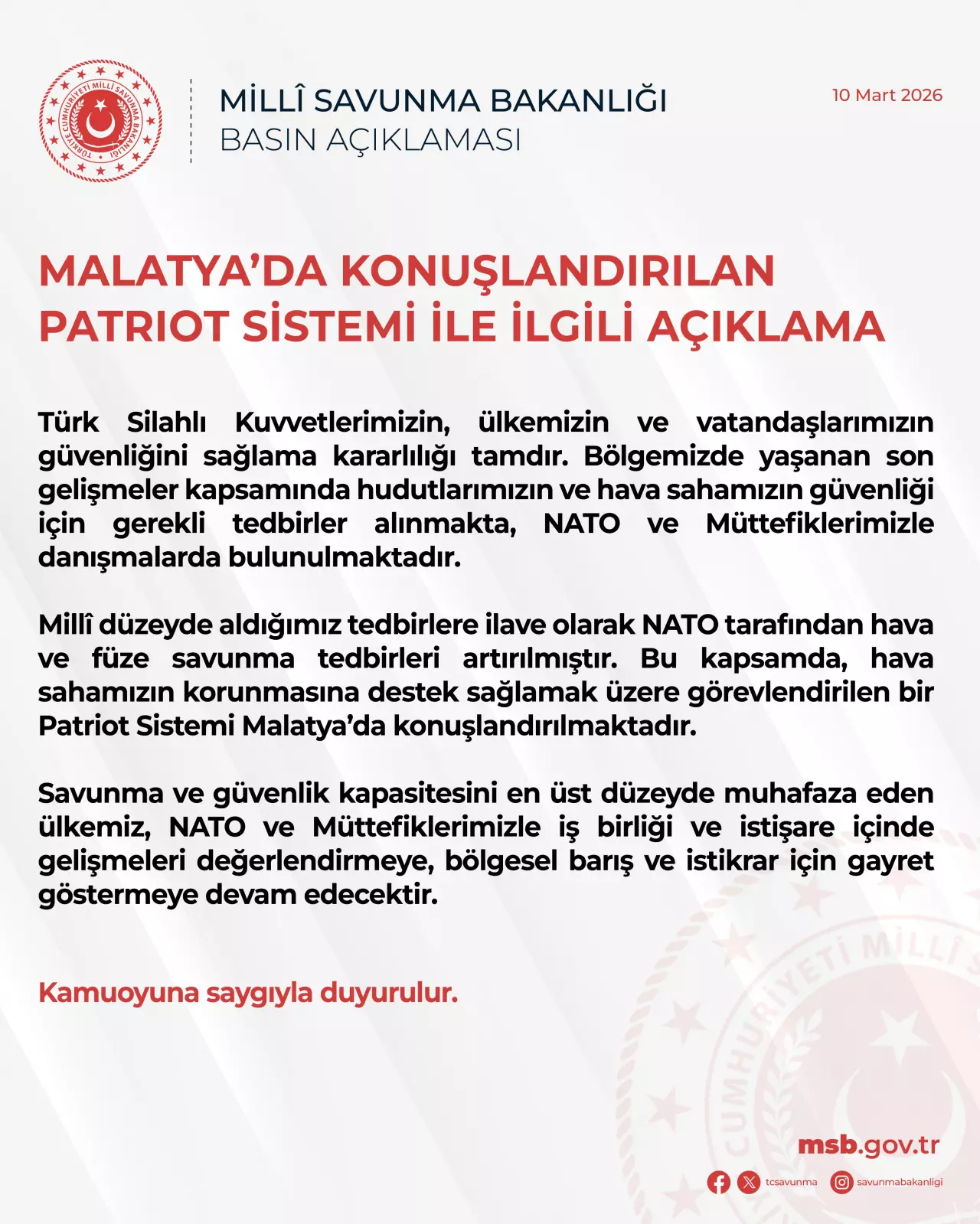 Milli düzeyde aldığımız tedbirlere ilave olarak NATO tarafından hava ve füze savunma tedbirleri alınmıştır. Bu kapsamda, hava sahamızın korunmasına destek sağlamak üzere görevlendirilen bir Patriot Sistemi Malatya’ya konuşlandırılmaktadır.