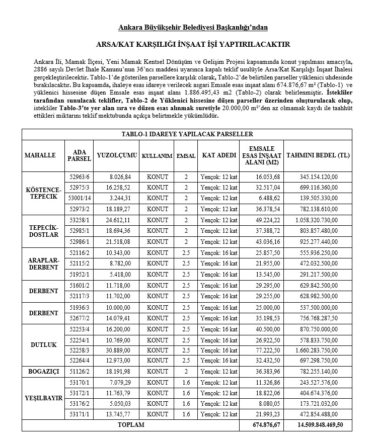 ABB tarafından yayımlanan resmi ilana göre, Yeni Mamak Kentsel Dönüşüm ve Gelişim Projesi kapsamında yapılacak işin toplam tahmini bedeli 56.630.759.636 TL olarak belirlendi. İhale, 29 Ocak 2026 Perşembe günü saat 14.30’da, Ankara Büyükşehir Belediyesi Encümen Salonu’nda, kapalı teklif usulüyle gerçekleştirilecek.