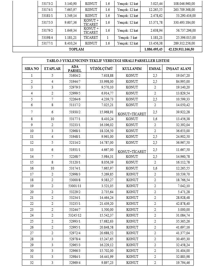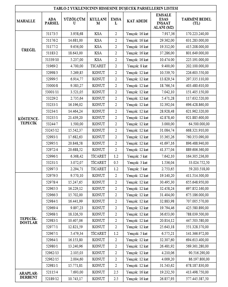 İhalenin mali ve mekânsal dağılımı ise kamu yararından çok yüklenici lehine bir tabloyu gözler önüne serdi. Proje kapsamında belediyeye teslim edilecek inşaat alanı 674 bin 876 metrekare ile sınırlı tutulurken, ihaleyi kazanacak firmaya bırakılacak alan bunun yaklaşık üç katına ulaşarak 1 milyon 886 bin 495 metrekare olarak belirlendi. Yüklenici hissesine düşen parsellerin toplam tahmini bedelinin 42 milyar 120 milyon TL’yi aşması dikkat çekerken, belediyeye kalan parsellerin değeri ise 14 milyar 509 milyon TL seviyesinde kaldı.