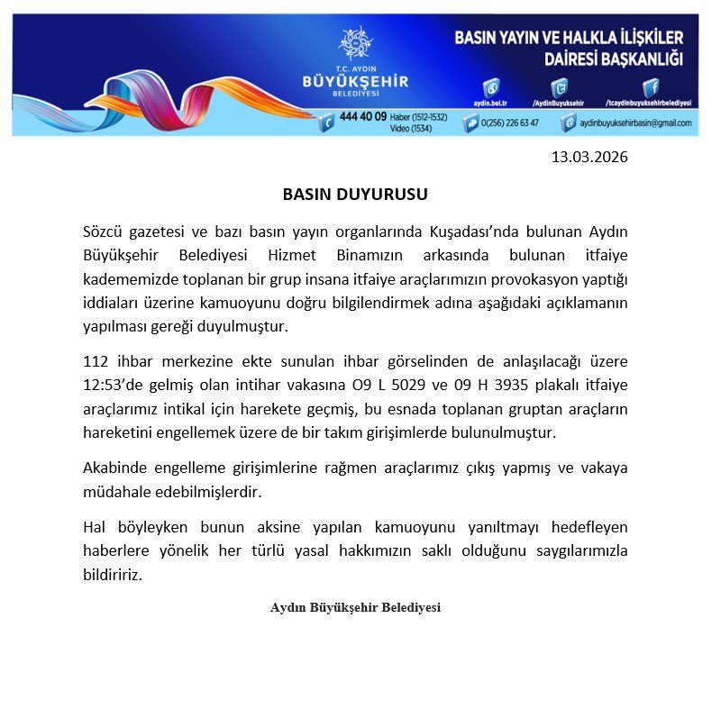 Ancak Aydın Büyükşehir Belediyesi’nden yapılan resmi basın duyurusunda bu iddiaların tamamen asılsız olduğu açıklandı. Belediyenin açıklamasında, 112 İhbar Merkezi’ne saat 12.53’te bir intihar vakası ihbarı geldiği ve 09 L 5029 ile 09 H 3935 plakalı itfaiye araçlarının bu ihbar üzerine acil olarak olay yerine intikal etmek üzere hareket ettiği belirtildi.