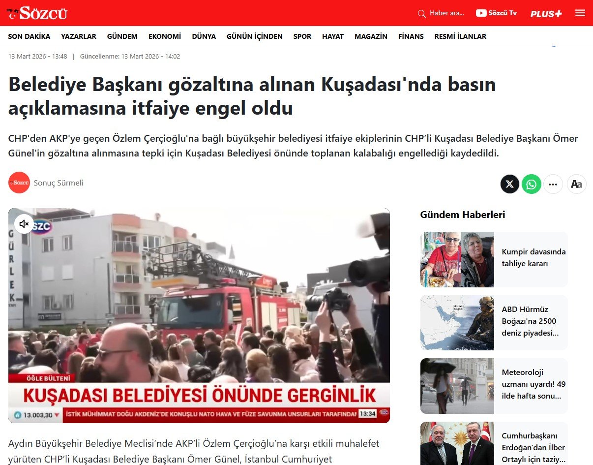 Bu sırada olay yerine giden Aydın Büyükşehir Belediyesi‘ne ait itfaiye ekiplerinin, kalabalığın basın açıklamasını engellediği yönünde CHP’ye yakın medya organlarında iddialar ortaya atıldı. Sözcü gazetesi de haberi “CHP’den AKP’ye geçen Özlem Çerçioğlu’nun bağlı olduğu büyükşehir belediyesinin itfaiye ekipleri kalabalığı engelledi” şeklinde servis ederek kamuoyunda algı oluşturmaya çalıştı.