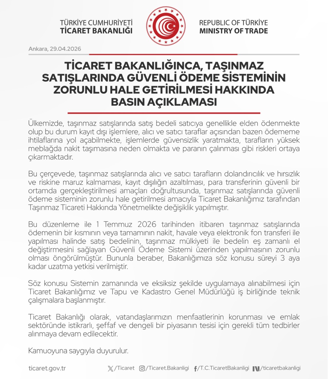 Ticaret Bakanlığı, taşınmaz satışlarında güvenli ödeme sisteminin zorunlu hale getirilmesine ilişkin basın açıklaması yayımladı.