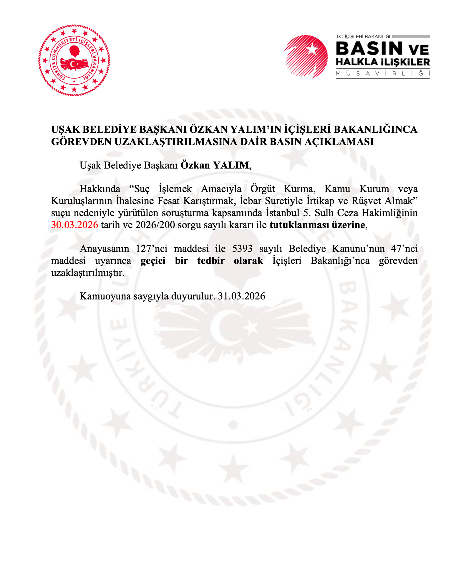 Uşak Belediye Başkanı Özkan Yalım, Hakkında “Suç İşlemek Amacıyla Örgüt Kurma, Kamu Kurum veya Kuruluşlarının İhalesine Fesat Karıştırmak, İcbar Suretiyle İrtikap ve Rüşvet Almak” suçu nedeniyle yürütülen kapsamında 5. Sulh Hakimliğinin 30.03.2026 tarih ve 2026/200 sorgu sayılı kararı ile tutuklanması üzerine, Anayasanın 127’nci maddesi ile 5393 sayılı Belediye Kanunu’nun 47’nci maddesi uyarınca geçici bir tedbir olarak İçişleri Bakanlığı’nca görevden uzaklaştırılmıştır.