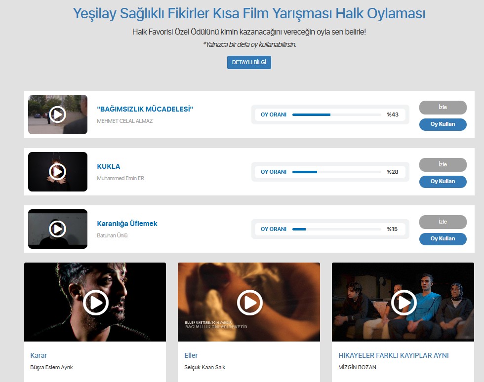 12 Ekim’de başvuru alımları sona eren yarışmada, 30 Ekim’de başlayan halk oylaması için 4 Kasım 2025 son gün. Vatandaşlar, gençlerin bağımlılıkla mücadeleyi anlattığı filmleri https://kisafilm.yesilay.org.tr/halk-oylamasi adresi üzerinden izleyerek oylarını kullanabiliyor.